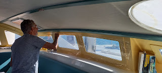 We zijn op zoek naar krimpfolie om voor de ramen te plakken zodat er “dubbel glas” ontstaat. Het is overdag dan nog wel zomers warm maar zodra de zon het voor gezien houdt keldert de temperatuur en straalt de kou van de ramen. We zijn met z’n tweetjes al eens naar de stad gelopen zonder resultaat. Gilda biedt aan om met haar auto op speurtocht te gaan, deze keer mét resultaat. En dus is Frits twee dagen bezig met meten , knippen en plakken van het plastic nadat ik alles schoon gemaakt en ontvet heb. Als het vast geplakt zit föhn ik het plastic warm en het trekt daardoor helemaal strak. Je kan er goed doorheen kijken en het scheelt inderdaad in koudestraling.